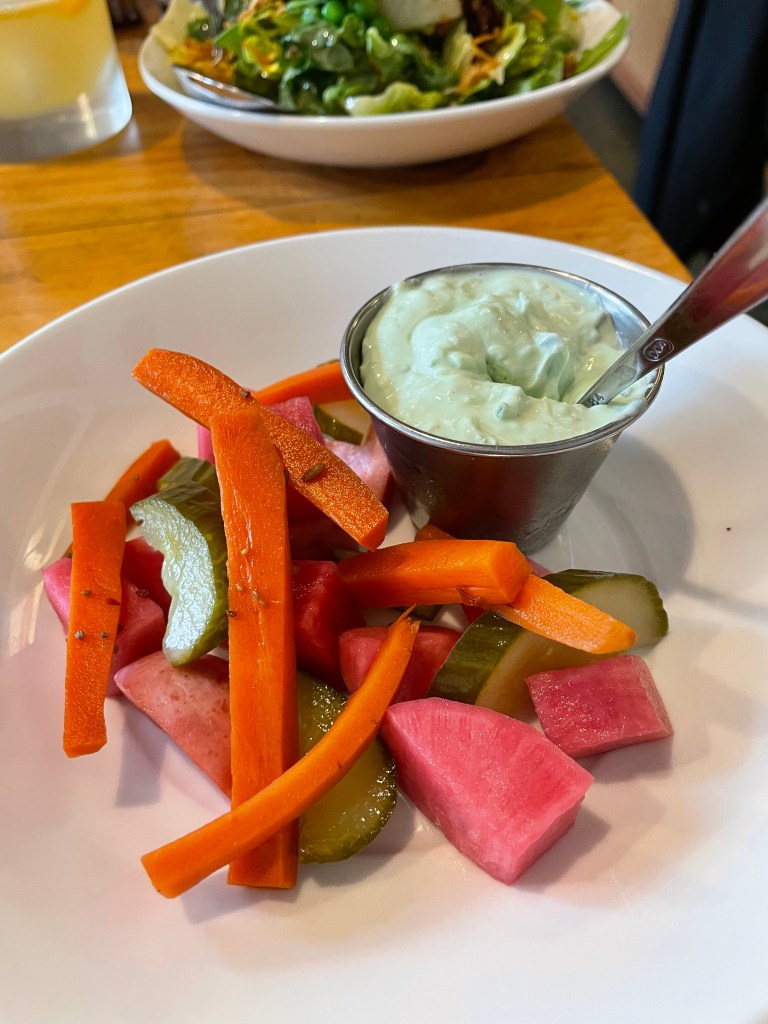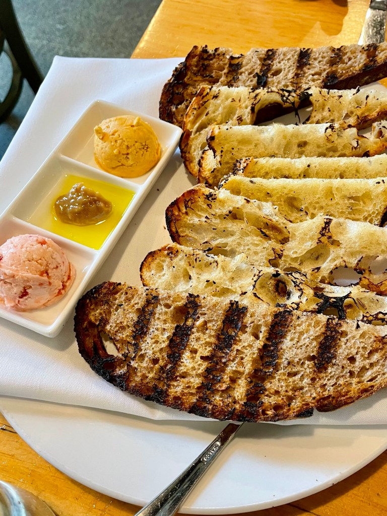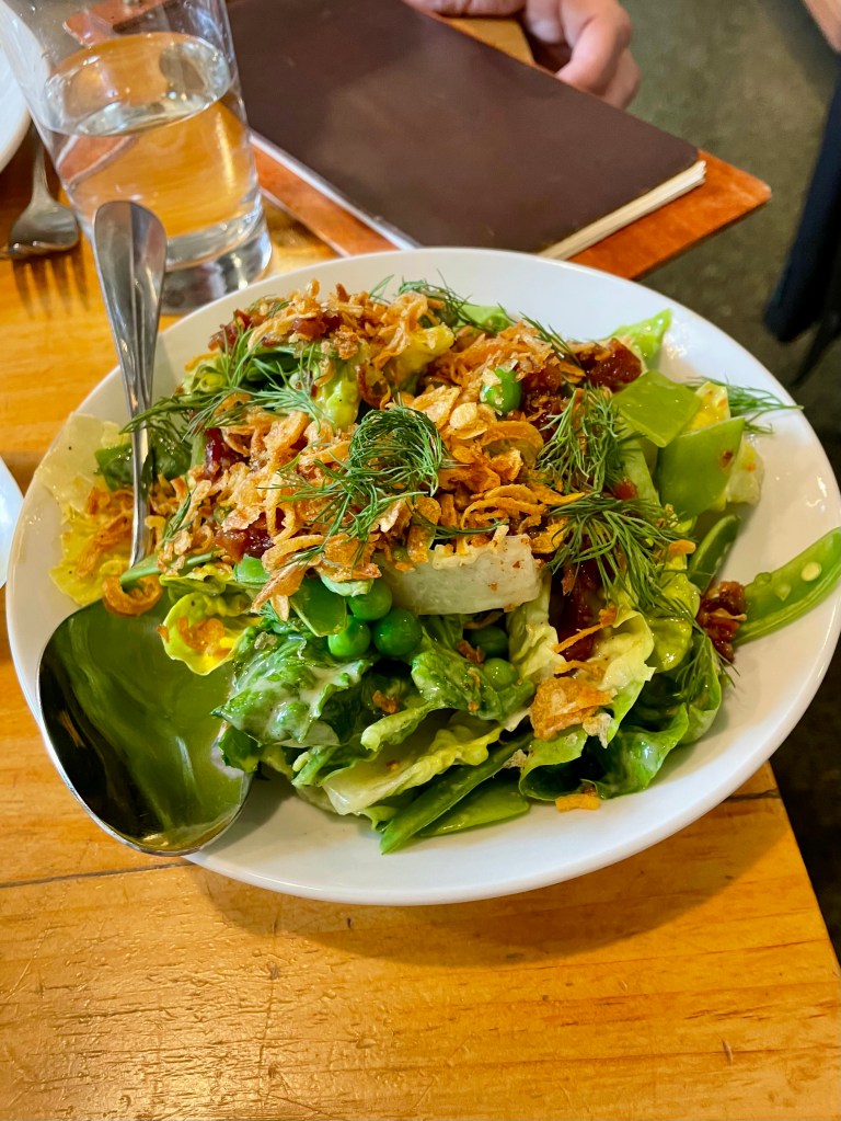 We were seated in the small indoor dining room. After we got settled with cocktails we poured over the menu. We decided to share the basket of restaurant made grilled bread and flavored butters, an assortment of pickled vegetables, and a gem salad that had peas, dill, crispy shallots, and lemon vinaigrette. Bruce had a miller amish semi-boneless half chicken with heirloom blue grits, braised radish, fried ramps, and harissa. I had spinach ricotta dumpling, fontina fondue, confited leek, aged balsamic, fried parsley. All this was enjoyed with a Chenin Blanc that had the acid, floral, and mineral notes of a Reisling with the relatively heavier mouth feel of a Chardonnay. It was the perfect versatility for both of our dishes. We sat near a young couple heading off to their senior prom. When I heard one of them say “mom” my head shot in her direction, like all mom’s do! It turns out the couple both worked at this restaurant and one of them was the daughter of the owner.